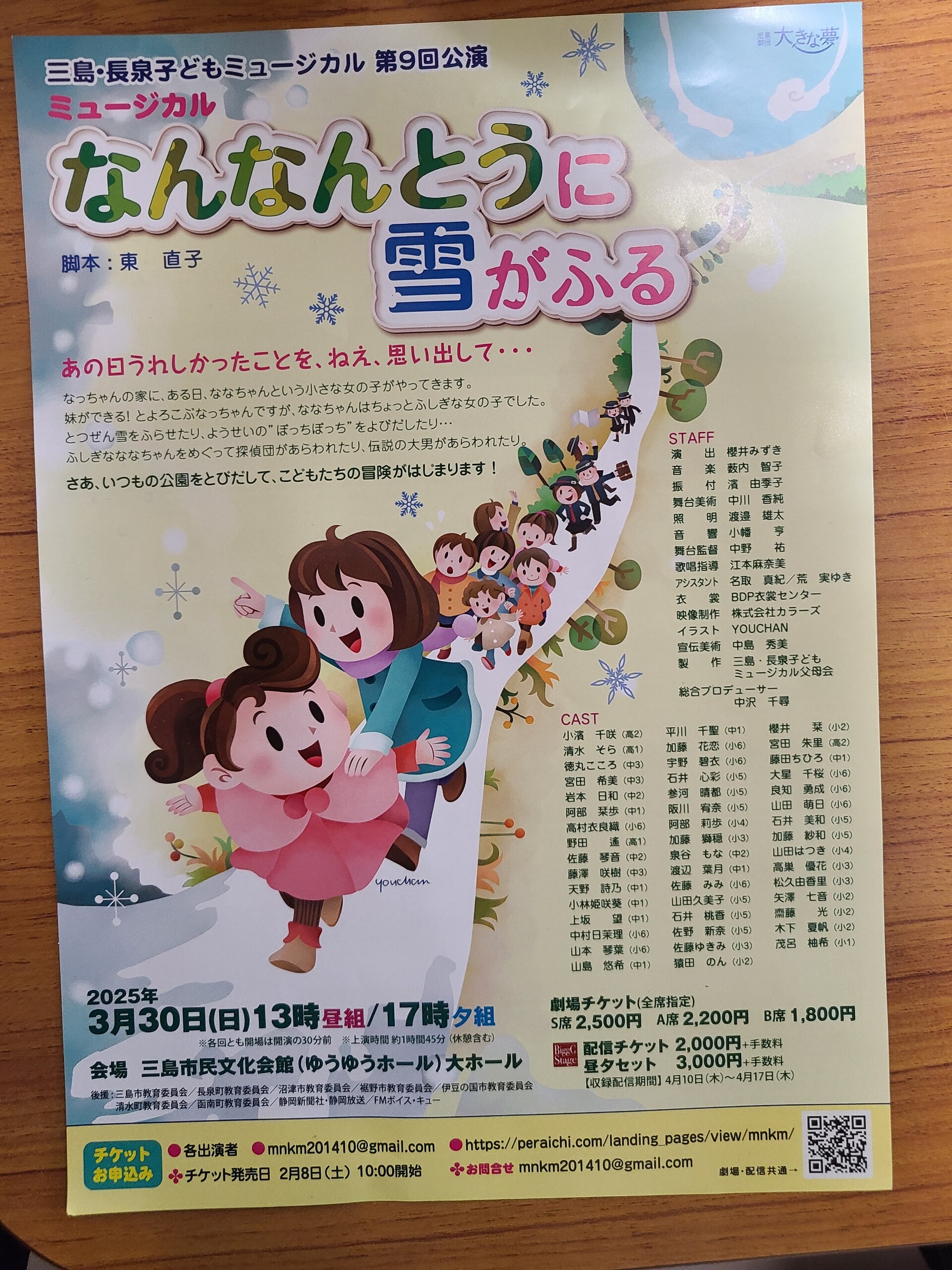 2025 3月 21 13:16:00 ミュージカル「なんなんとうに雪がふる」 こんにちは。スタッフの西島です。今日は素敵なお知らせをさせてください(^o^)/小さい頃から当院に通ってくれていた岩本日和さんが出演するミュージカルが3月30日に三島市民文化会館ゆうゆうホールにて公演されます!!素敵な女性に成長された日和さんのミュージカル、とても楽しみです♪ご紹介☆↓↓↓『なんなんとうに雪がふる』脚本:東 直子さんあの日うれしかったことを、ねぇ、思い出して…なっちゃんの家に、ある日、ななちゃんという小さな女の子がやってきます。妹ができる!とよろこぶなっちゃんですが、ななちゃんはちょっとふしぎな女の子でした。とつぜん雪をふらせたり、ようせいの"ぼっちぼっち"をよびだしたり…ふしぎなななちゃんをめぐって探偵団があらわれたり、伝説の大男があらわれたり。さぁ、いつもの公園をとびだして、こどもたちの冒険がはじまります!どんな物語なのか、とてもワクワクしますね!ぜひ皆さん、3月30日三島市民文化会館へお越しください(^_^)↓↓↓ホームページhttps://peraichi.com/landing_pages/view/mnkm/お問い合わせmnkm201410@gmail.com